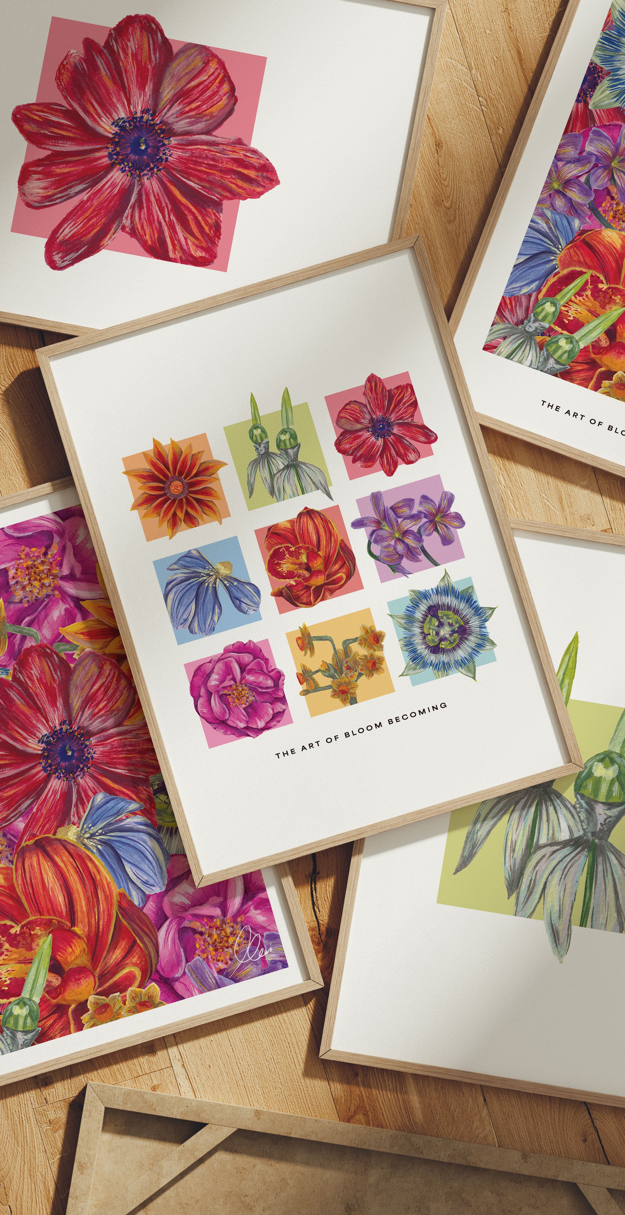 The Balancing Blooms floral fine art wall print collection started with the goal to bring creativity to my everyday, by painting one flower a week for nine weeks. Now, each flower holds a story of its own, displayed through a collection of hand-painted floral wall art, documented at the time of creation.