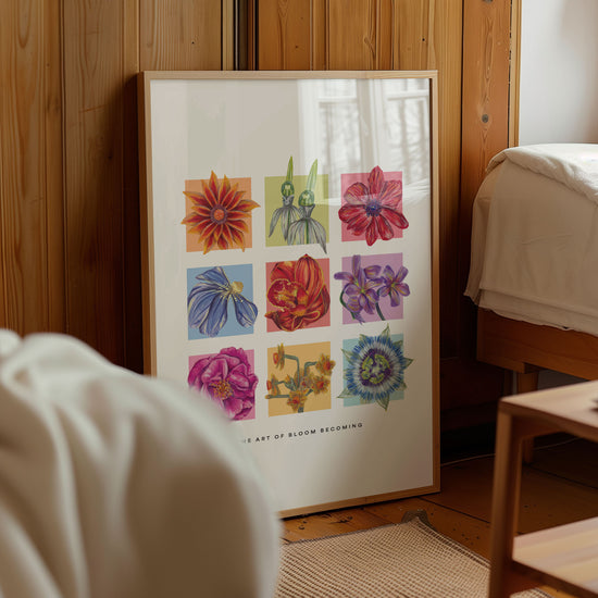 This botanical fine art print features nine delicate floral paintings displayed in a colourful grid layout alongside an aspirational quote, 'The Art Of Bloom Becoming'. It showcases each flower's vibrant colours and textures painted using gouache, and professionally printed on archival fine art paper. This artwork adds colour, life, and elegance to any space - designed to be displayed solo, or paired and matched with other fine art prints in the Balancing Blooms collection.